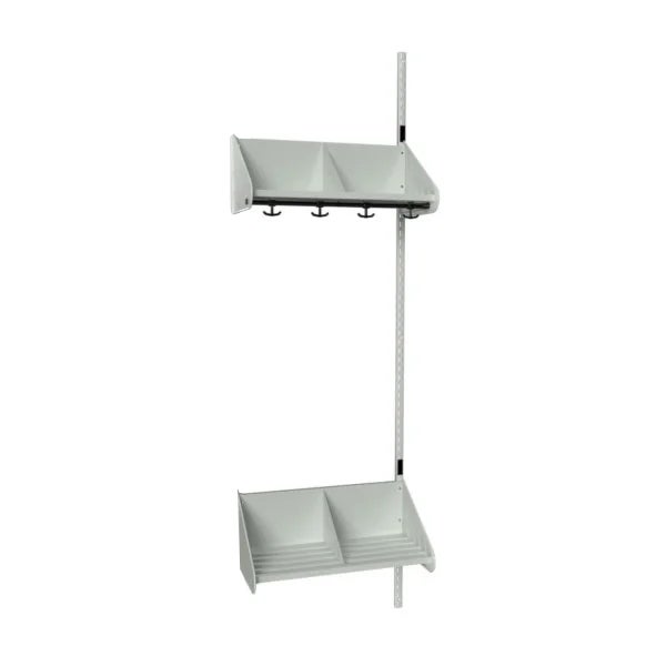 Det flexibla inredningssystemet avsett för entréer och kapprum. Enheterna i pulverlackerad stålplåt med hög finish. Påbyggnadssektionen består av 1 st väggskena längd 2000 mm, 1 st hatthylla samt 1 st skohylla. Hatt- och skohyllorna är avdelade med mellanväggar. Kroklist och dropplåt finns som tillval. Kan fås i 15 olika färger.