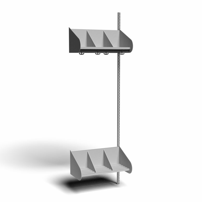 Det flexibla inredningssystemet avsett för entréer och kapprum. Enheterna i pulverlackerad stålplåt med hög finish. Påbyggnadssektionen består av 1 st väggskena längd 2000 mm, 1 st hatthylla samt 1 st skohylla. Hatt- och skohyllorna är avdelade med mellanväggar. Kroklist och dropplåt finns som tillval. Kan fås i 15 olika färger.