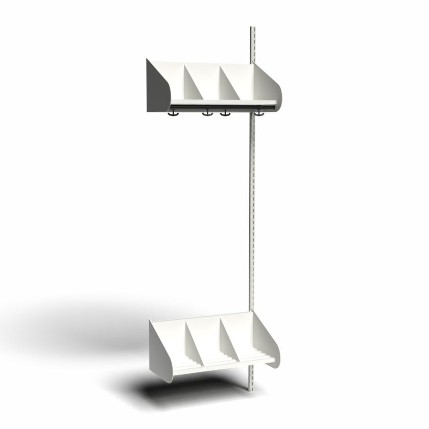 Det flexibla inredningssystemet avsett för entréer och kapprum. Enheterna i pulverlackerad stålplåt med hög finish. Påbyggnadssektionen består av 1 st väggskena längd 2000 mm, 1 st hatthylla samt 1 st skohylla. Hatt- och skohyllorna är avdelade med mellanväggar. Kroklist och dropplåt finns som tillval. Kan fås i 15 olika färger.