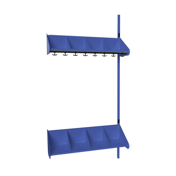 Det flexibla inredningssystemet avsett för entréer och kapprum. Enheterna i pulverlackerad stålplåt med hög finish. Påbyggnadssektionen består av 1 st väggskena längd 2000 mm, 1 st hatthylla samt 1 st skohylla. Hatt- och skohyllorna är avdelade med mellanväggar. Kroklist och dropplåt finns som tillval. Kan fås i 15 olika färger.