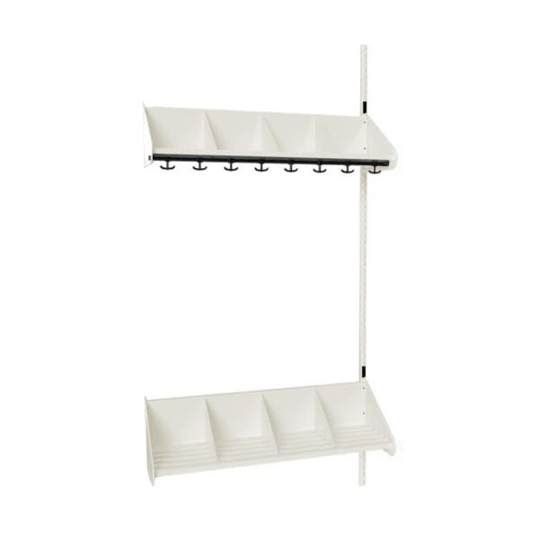 Det flexibla inredningssystemet avsett för entréer och kapprum. Enheterna i pulverlackerad stålplåt med hög finish. Påbyggnadssektionen består av 1 st väggskena längd 2000 mm, 1 st hatthylla samt 1 st skohylla. Hatt- och skohyllorna är avdelade med mellanväggar. Kroklist och dropplåt finns som tillval. Kan fås i 15 olika färger.