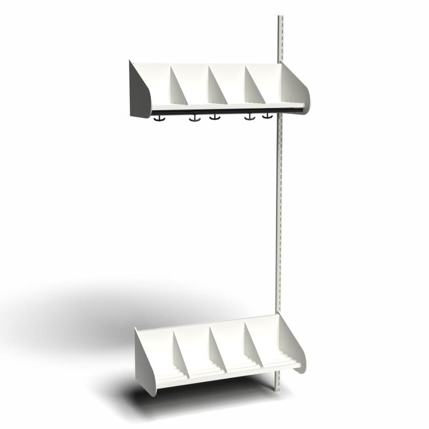Det flexibla inredningssystemet avsett för entréer och kapprum. Enheterna i pulverlackerad stålplåt med hög finish. Påbyggnadssektionen består av 1 st väggskena längd 2000 mm, 1 st hatthylla samt 1 st skohylla. Hatt- och skohyllorna är avdelade med mellanväggar. Kroklist och dropplåt finns som tillval. Kan fås i 15 olika färger.