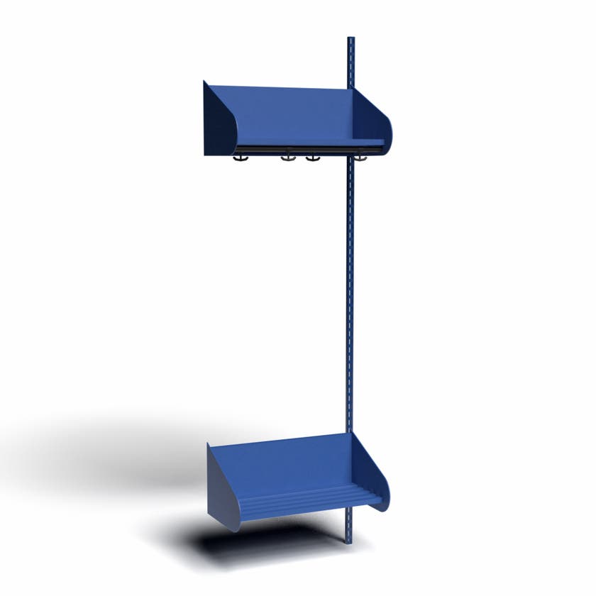 Flexibelt inredningssystem för entréer och kapprum. Tillverkat i pulverlackerad stålplåt med hög finish. Välj mellan en mängd olika standardfärger.