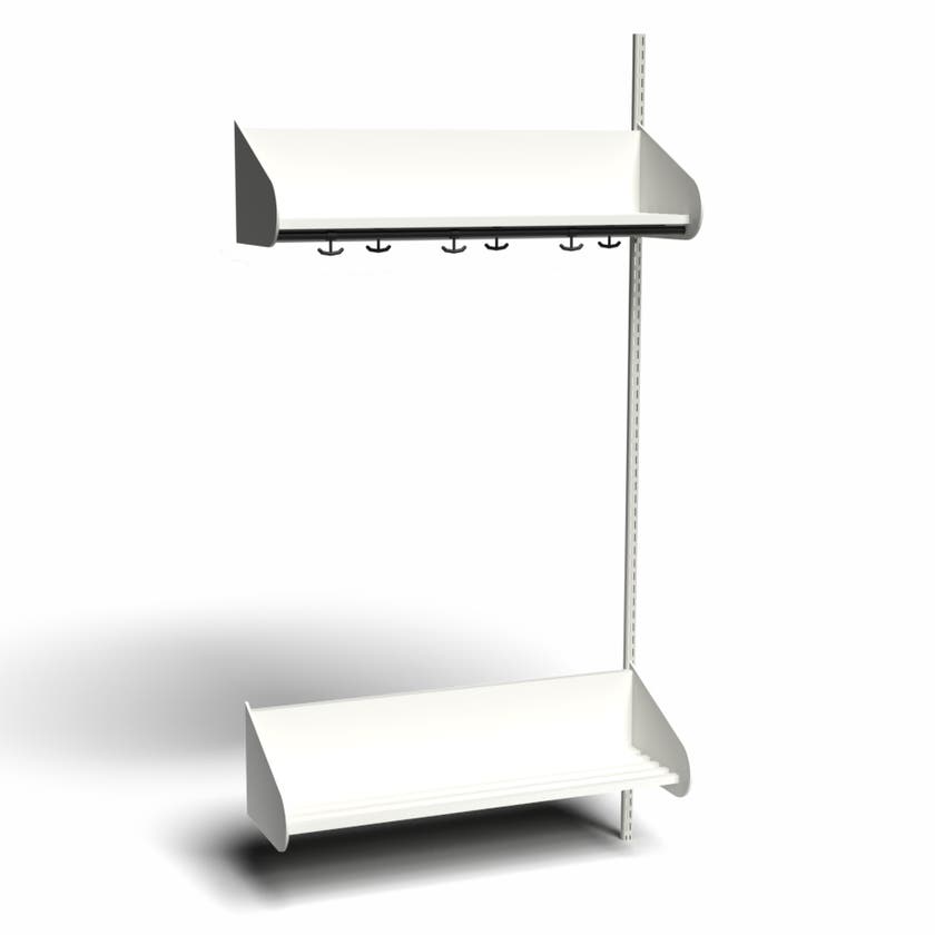 Flexibelt inredningssystem för entréer och kapprum. Tillverkat i pulverlackerad stålplåt med hög finish. Välj mellan en mängd olika standardfärger.