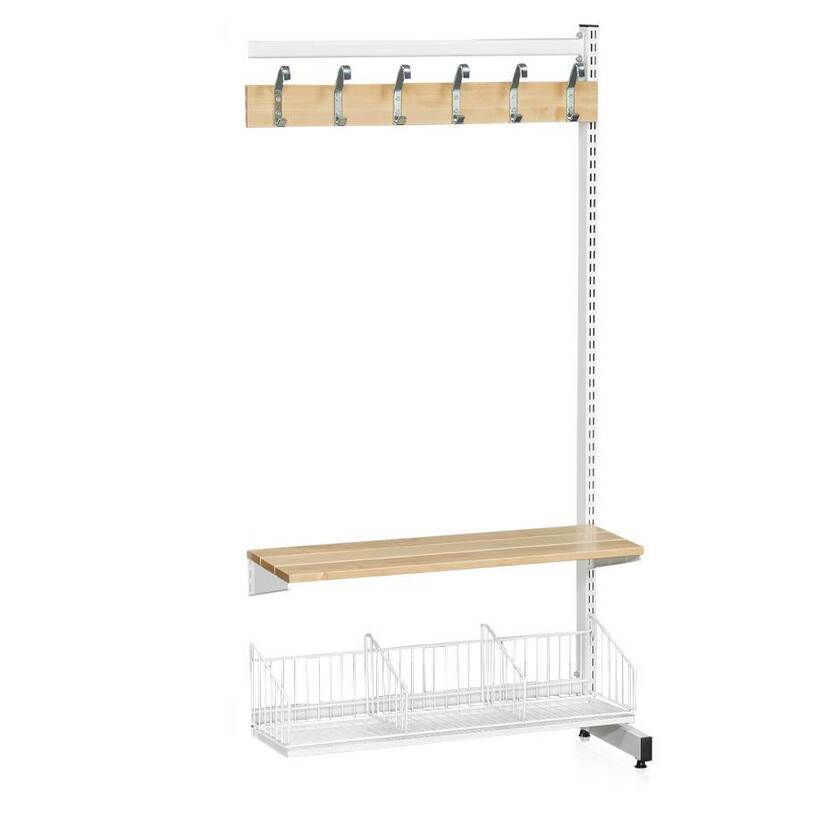 Tilläggssektion som består av 1 perforerat l-stativ (1787 mm), 2 mellanstag (900 mm), skohylla med dropplåt (900 mm), sittbänk (900 mm) och kroklist (900 mm) med 6 skolkrokar dubbel. Komplettera med olika tillbehör och följdsektion för att skapa din optimala lösning för just ditt utrymme.