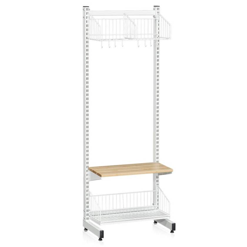 Komplett stativ som består av 2 perforerade l-stativ (1787 mm), 2 mellanstag (600 mm), skohylla med dropplåt (600 mm), hatthylla (600 mm) och sittbänk (600 mm). Komplettera med olika hyllor, följdsektion och krokar för att skapa din optimala förvaringslösning för just ditt utrymme.