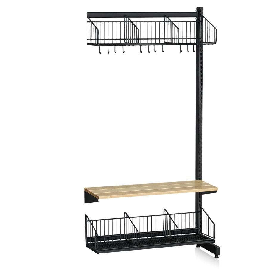 Tilläggssektion som består av 1 perforerat l-stativ (1787 mm), 2 mellanstag (900 mm), skohylla med dropplåt (900 mm), hatthylla (900 mm) och sittbänk (900 mm). Komplettera med olika tillbehör och följdsektion för att skapa din optimala lösning för just ditt utrymme.