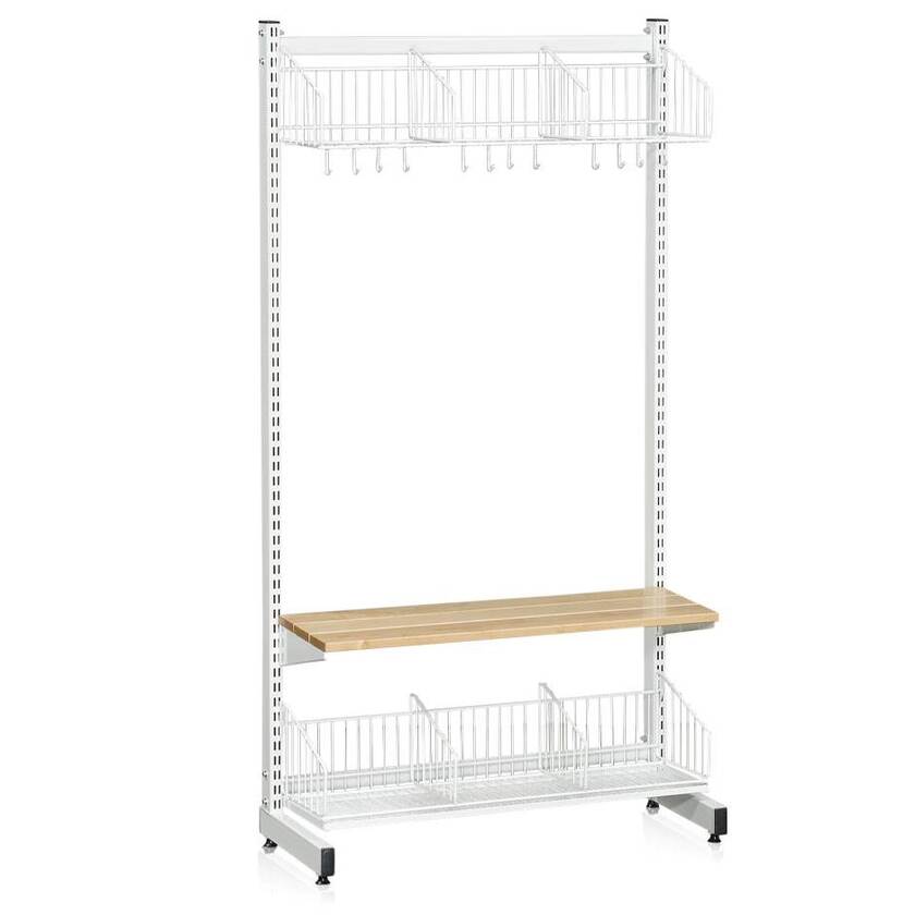 Komplett stativ som består av 2 perforerade l-stativ (1787 mm), 2 mellanstag (900 mm), skohylla med dropplåt (900 mm), hatthylla (900 mm) och sittbänk (900 mm). Komplettera med olika hyllor, följdsektion och krokar för att skapa din optimala förvaringslösning för just ditt utrymme.