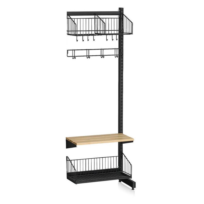 Tilläggssektion som består av 1 perforerat l-stativ (1787 mm), 2 mellanstag (600 mm), skohylla med dropplåt (600 mm), hatthylla (600 mm), kroklist med 4 krokar (600 mm) och sittbänk (600 mm). Komplettera med olika tillbehör och följdsektion för att skapa din optimala lösning för just ditt utrymme.