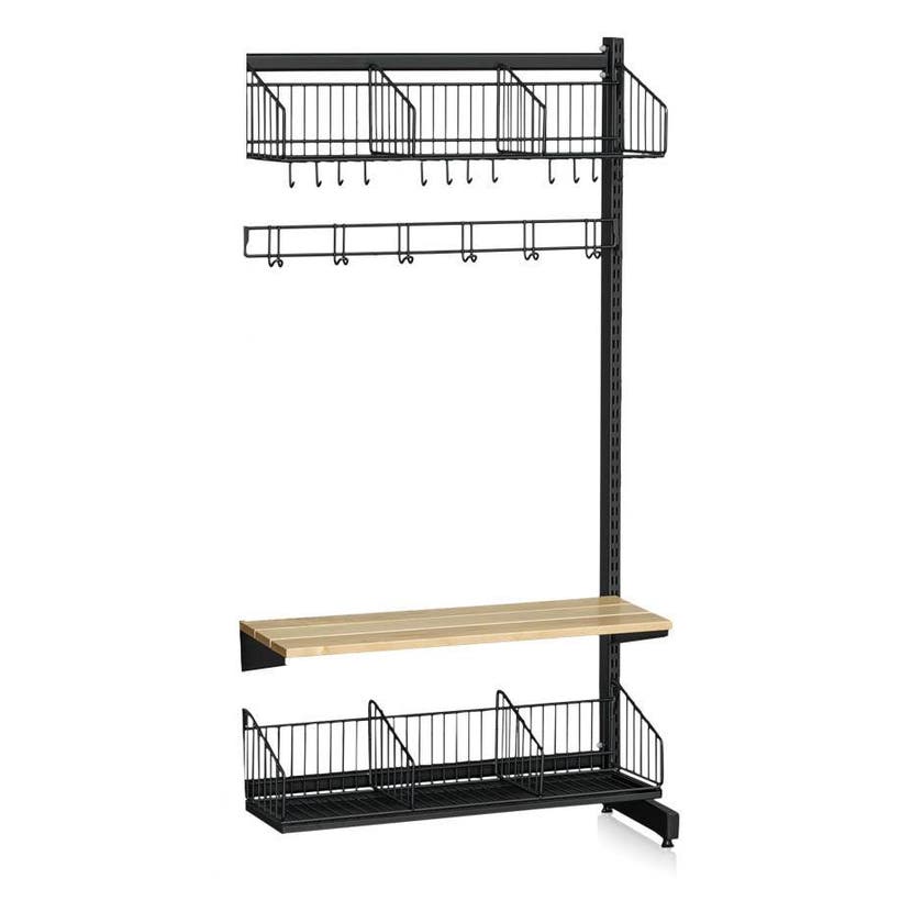 Tilläggssektion som består av 1 perforerat l-stativ (1787 mm), 2 mellanstag (900 mm), skohylla med dropplåt (900 mm), hatthylla 900 mm), kroklist med 6 krokar (900 mm) och sittbänk (900 mm). Komplettera med olika tillbehör och följdsektion för att skapa din optimala lösning för just ditt utrymme.