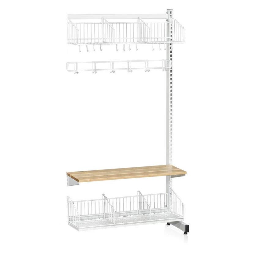 Tilläggssektion som består av 1 perforerat l-stativ (1787 mm), 2 mellanstag (900 mm), skohylla med dropplåt (900 mm), hatthylla 900 mm), kroklist med 6 krokar (900 mm) och sittbänk (900 mm). Komplettera med olika tillbehör och följdsektion för att skapa din optimala lösning för just ditt utrymme.