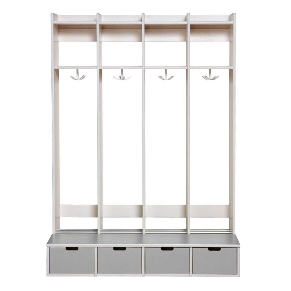 Klädförvaring med förvaring under sittbänken, vilket gör att barnen själva kommer åt sakerna i sin låda. Lådfront och sittbänk är klädda med laminat, välj mellan sex möjliga nyanser. Varje fack är föresett med en öppen hylla, tropphylla samt en krysskrok. Förvaringslådan passar även till de övre facken. Dörrlucka finns som tillval. Tillverkad i 18 mm björkkryssfanér. Levereras monterad.