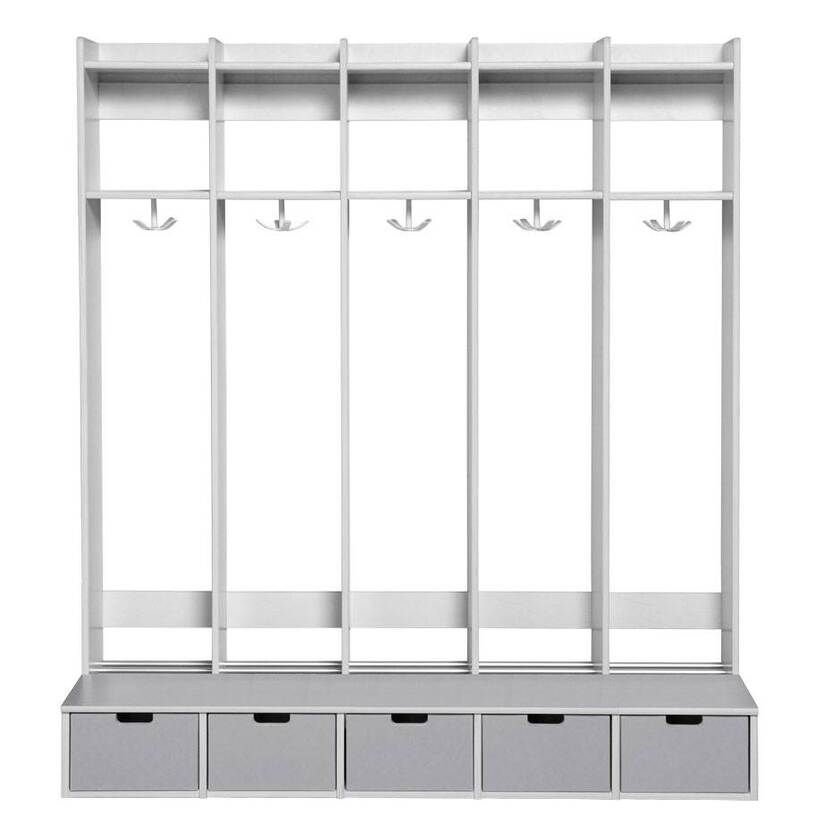 Klädförvaring med förvaring under sittbänken, vilket gör att barnen själva kommer åt sakerna i sin låda. Lådfront och sittbänk är klädda med laminat, välj mellan sex möjliga nyanser. Varje fack är föresett med en öppen hylla, tropphylla samt en krysskrok. Förvaringslådan passar även till de övre facken. Dörrlucka finns som tillval. Tillverkad i 18 mm björkkryssfanér. Levereras monterad.
