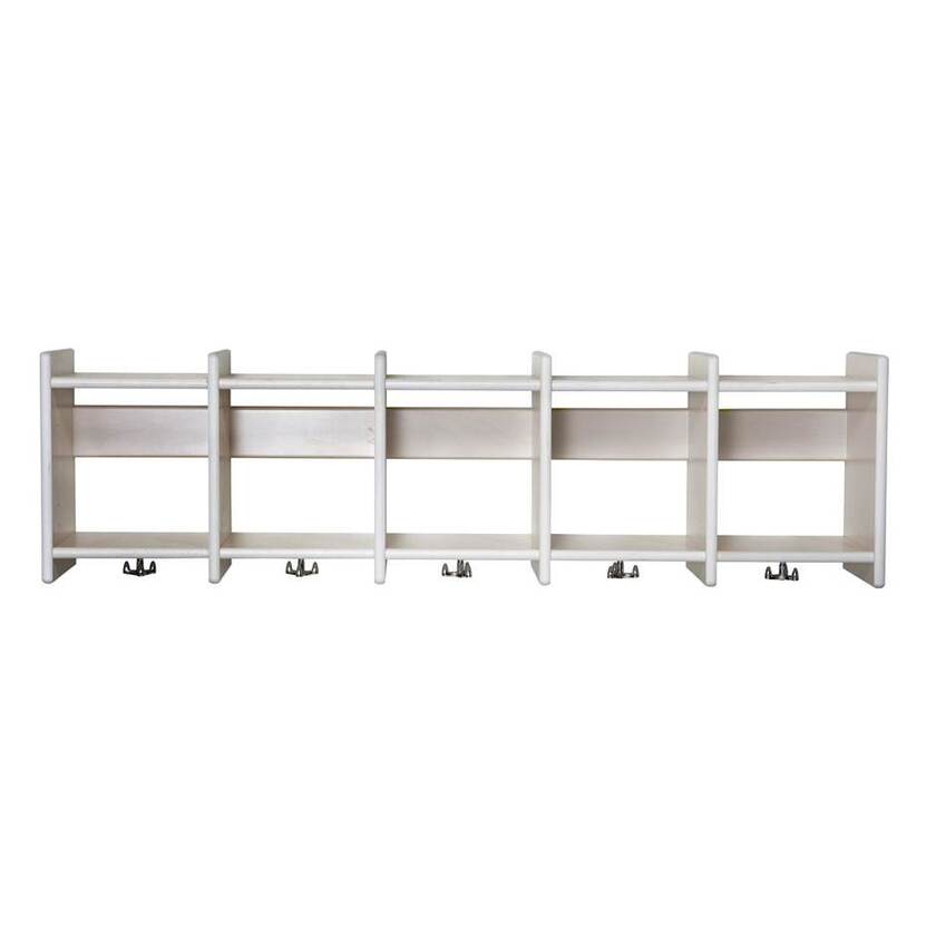 Vägghängd klädförvaringshylla med förvaringsfack och klädkrok. Finns i moduler om 1-5 fack i rad. Tillverkad av 18 mm vitpigmenterad björkfanér. Mått per fack B250 x H300 x D250 mm. Produktbilden visar hylla med 5 sektioner.