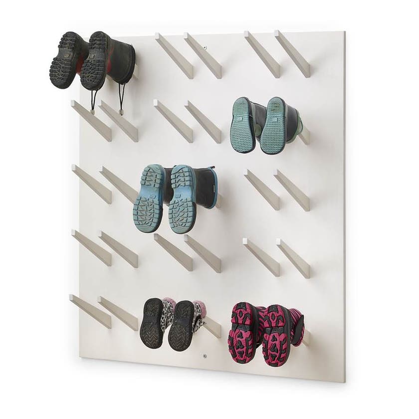 Stövelvägg för enkel hantering av stövlar och kängor. Monteras på vägg. De olika modellerna kombineras för att få rätt antal platser. Montera i bredd eller på höjd. Tillverkad i vitpigmeterad björkkryssfaner.