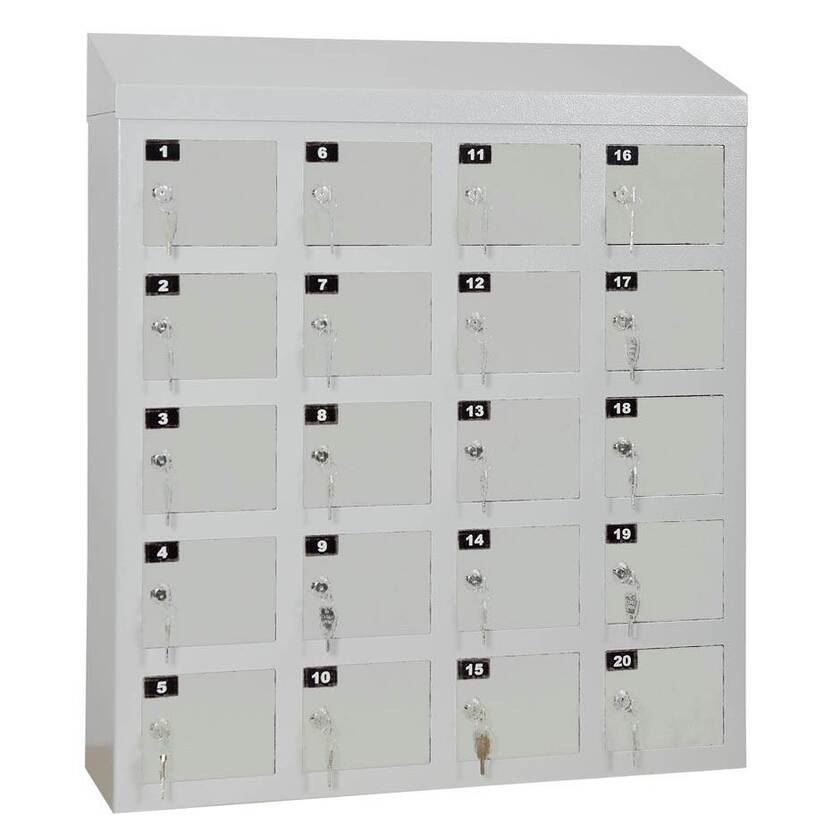 Vårt småfackskåp Mobil är ett praktiskt förvaringsskåp med 20 st låsbara fack i en modul. Passar utmärkt för förvaring och laddning av mobiltelefoner och smartphones, t.ex. i klassrum i skola. Varje lucka har ett cylinderlås där två nycklar ingår. Varje fack har ett eluttag och en mjuk matta i botten, för att skydda det som förvaras i skåpet mot repor.