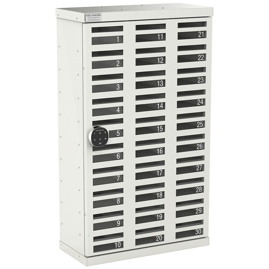 Skapa mobilfria zoner med hjälp av mobilförvaringsskåpet MBG 30. Mobilskåpet passar perfekt för klassrum i skolor, kontor, konferensrum, träningshallar och andra miljöer där man behöver kunna lägga ifrån sig telefonen och förvara den på smart och säker plats.