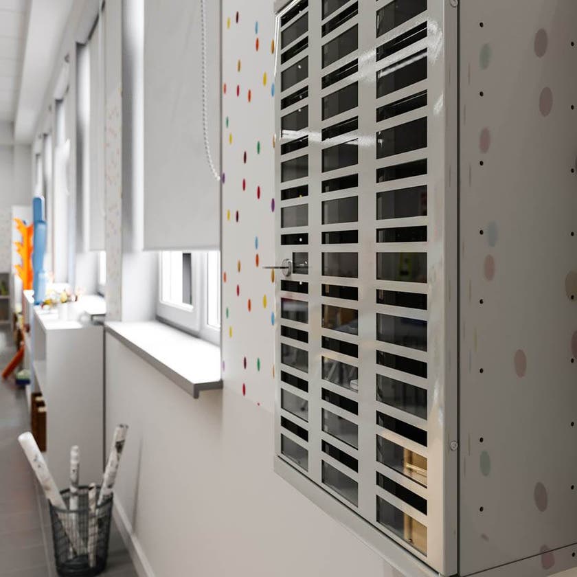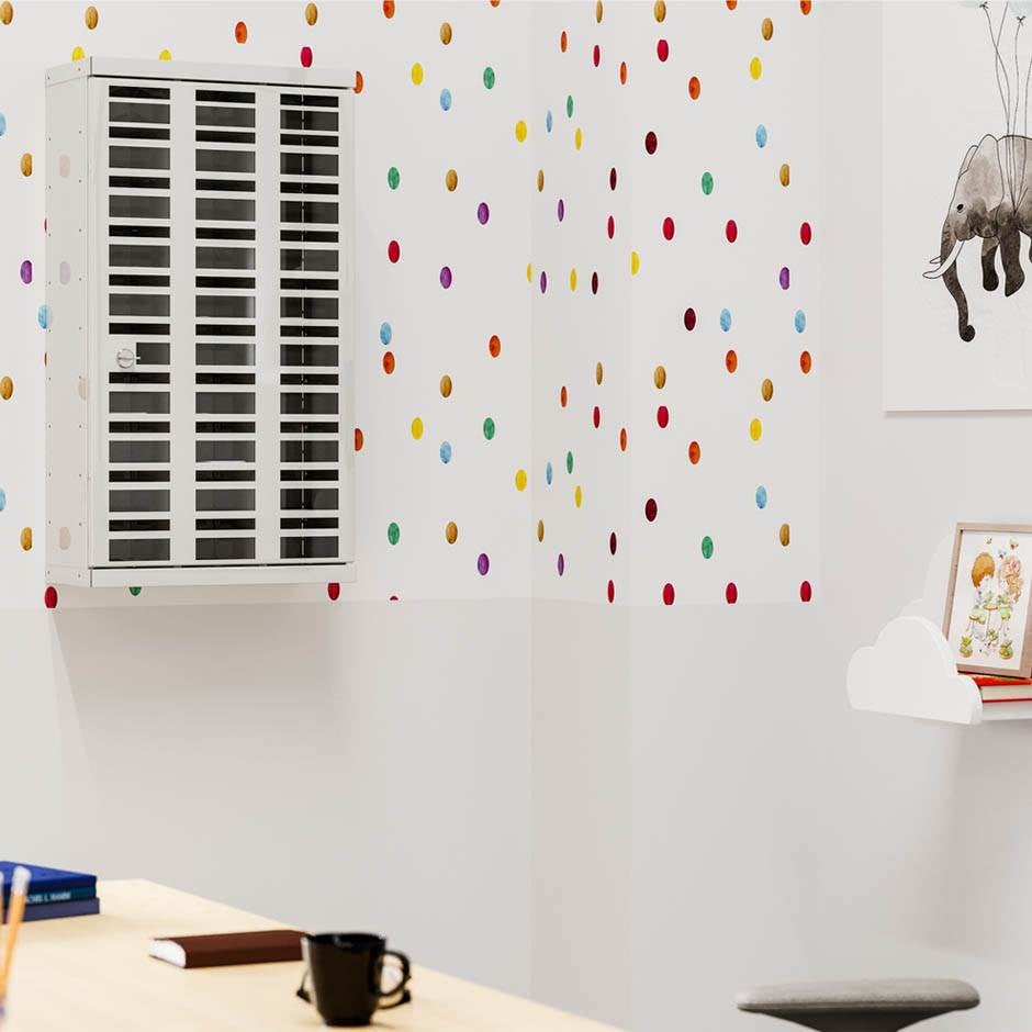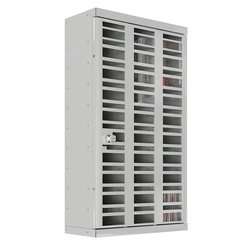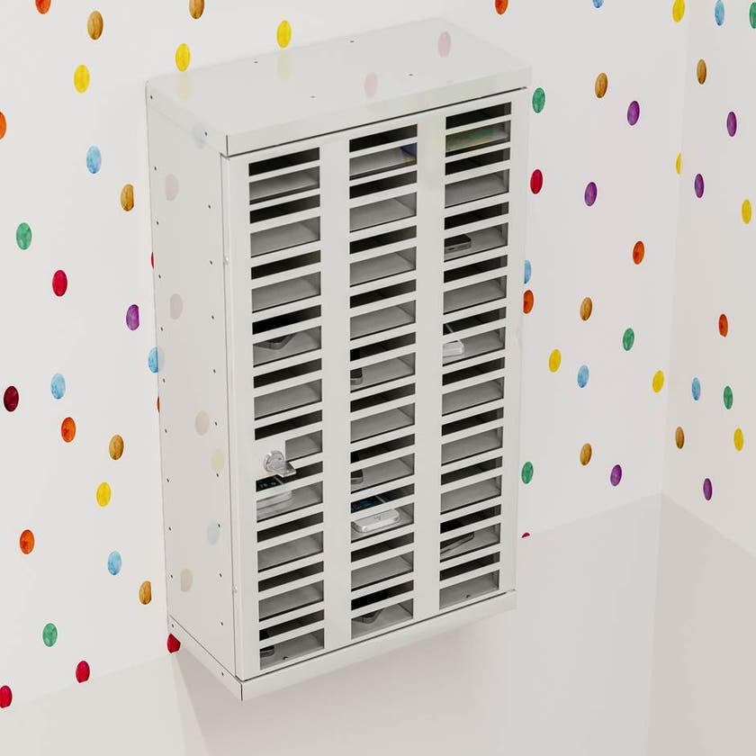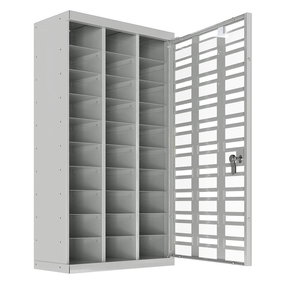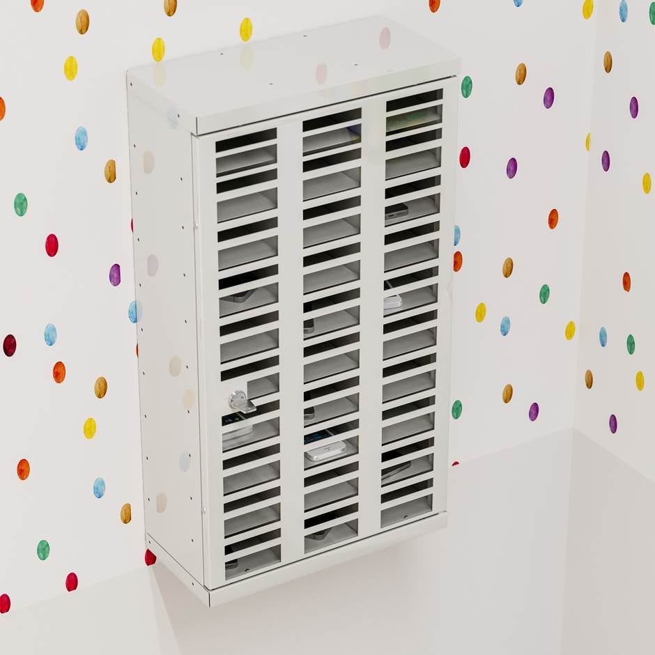 Låsbart förvaringsskåp med 30 numrerade fack som passar för tex mobiltelefoner. Skåpet är anpassat med inkast så att det går att stoppa in en mobil även när skåpet är låst. Fronten består av plexiglas så att innehållet är synligt. Skåpet monteras på vägg och cylinderlås inklusive två nycklar ingår som standard.