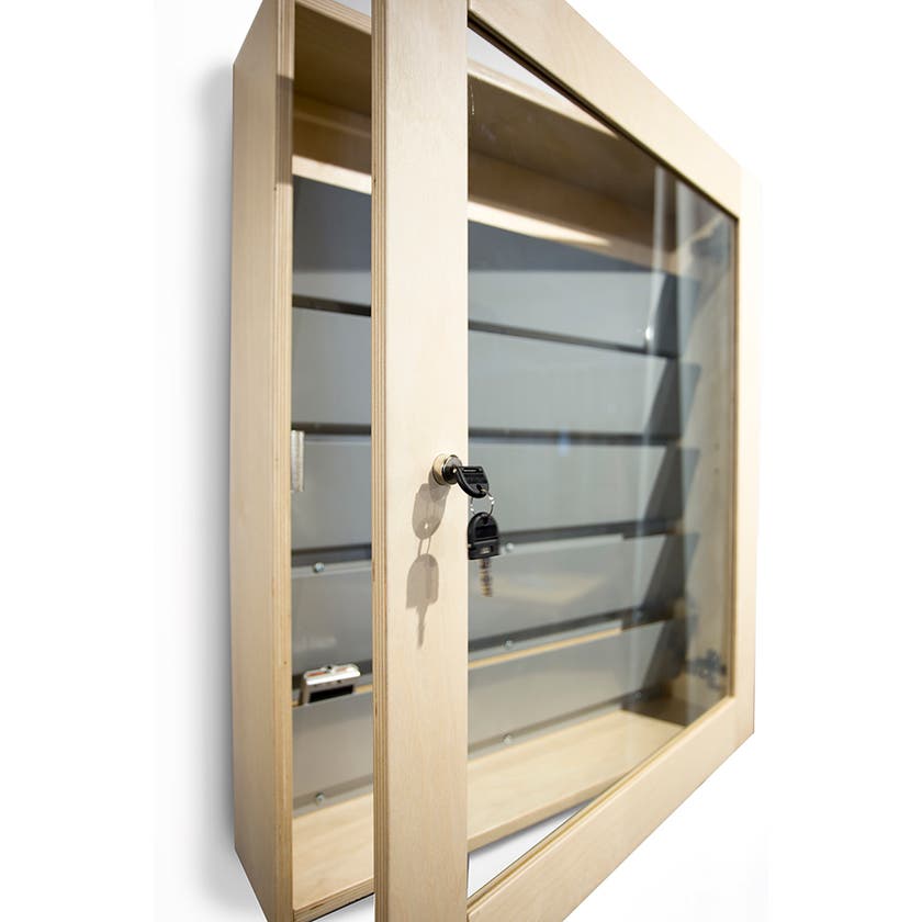 Mobilhotell Mora hängs på vägg. Stomme i björkmelamin och dörr med säkerhetsglas och cylinderlås, två nycklar ingår.