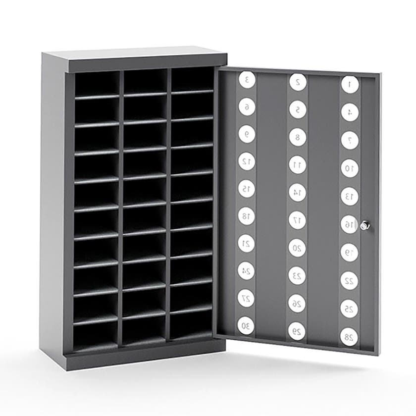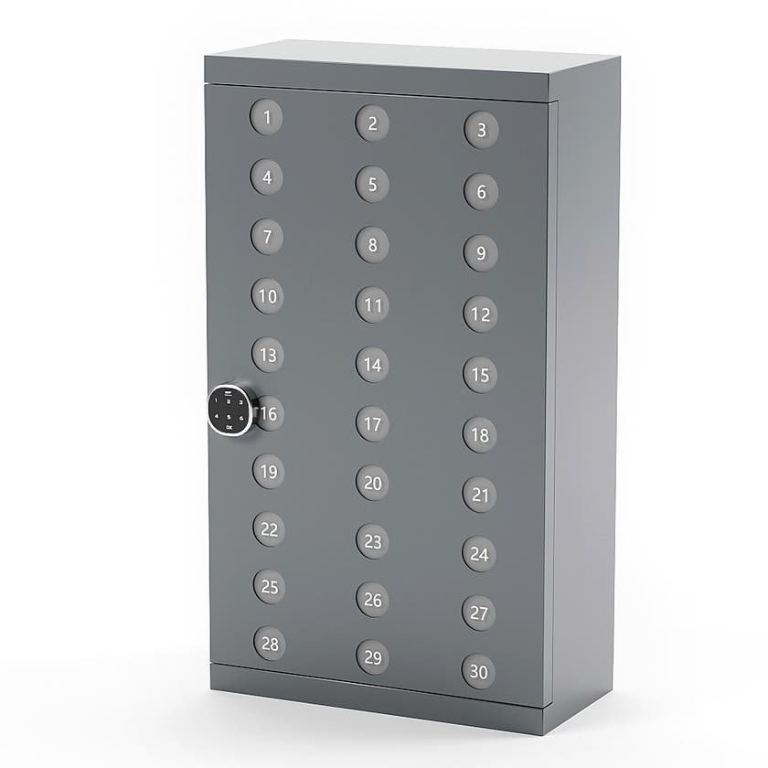 Mobilhotell med 30 numrerade fack för mobiltelefoner. Botten i varje fack är belagt med filt för att förhindra att telefonerna repas eller skadas. Hel dörr med kodlås ger läraren enkel öppning av skåpet. Tillverkat i stål, varje fack har Ø40 mm plexiglas för insyn. Förberett för väggmontering.