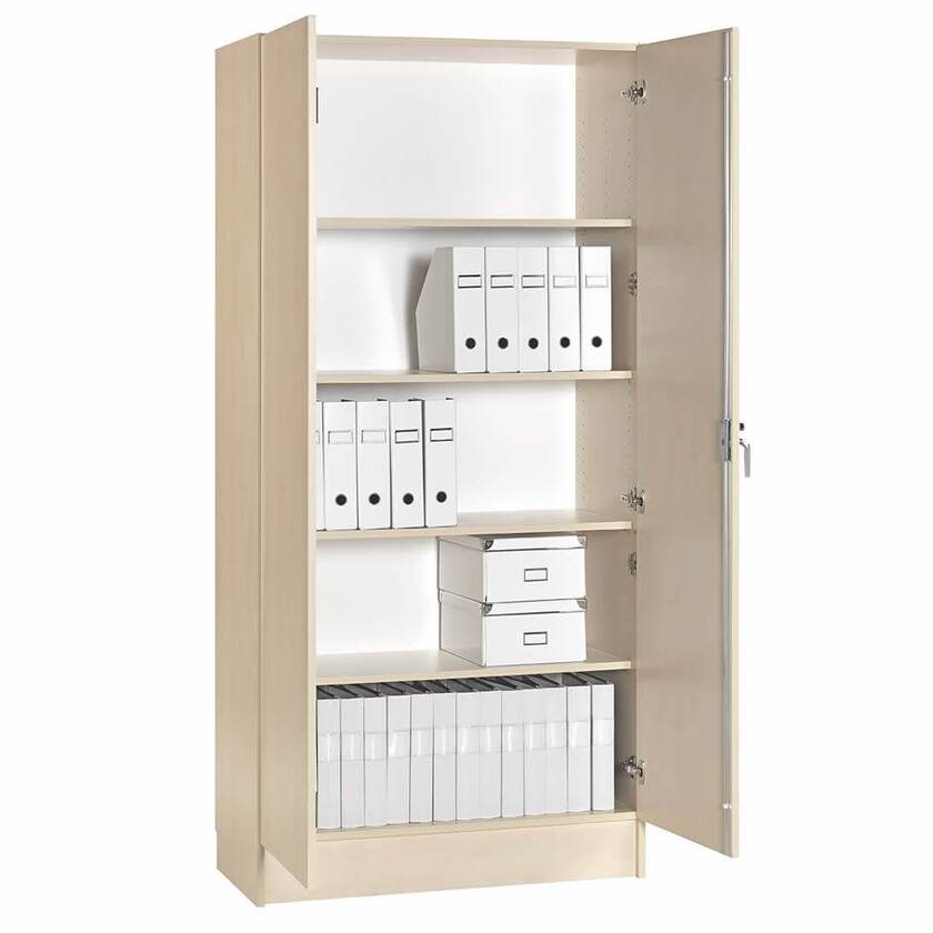 Kontor-/förvaringsskåp av hög kvalitet med en mängd användningsområden. Tillverkat i bok-, björk- eller vit laminat med 19 mm stomme och dörrar. Utrustat med spanjolett och spanjoletthandtag. Samtliga hyllplan är flyttbara med 32 mm intervall.