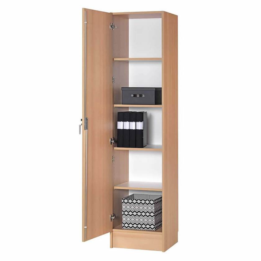 Kontor-/förvaringsskåp av hög kvalitet med en mängd användningsområden. Tillverkat i bok-, björk eller vit laminat med 19 mm stomme och dörr. Välj mellan vänster- eller högerhängd dörr. Utrustat med spanjolett och spanjoletthandtag. Samtliga hyllplan är flyttbara med 32 mm intervall.