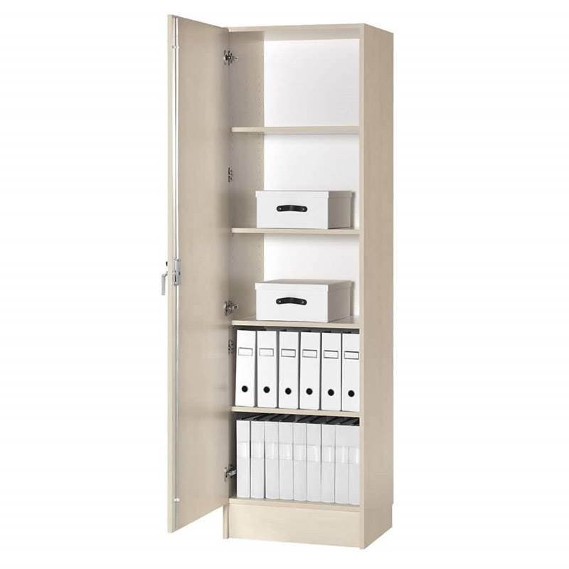 Kontor-/förvaringsskåp av hög kvalitet med en mängd användningsområden. Tillverkat i bok-, björk- eller vit laminat med 19 mm stomme och dörr. Välj mellan vänster- eller högerhängd dörr. Utrustat med spanjolett och spanjoletthandtag. Samtliga hyllplan är flyttbara med 32 mm intervall.
