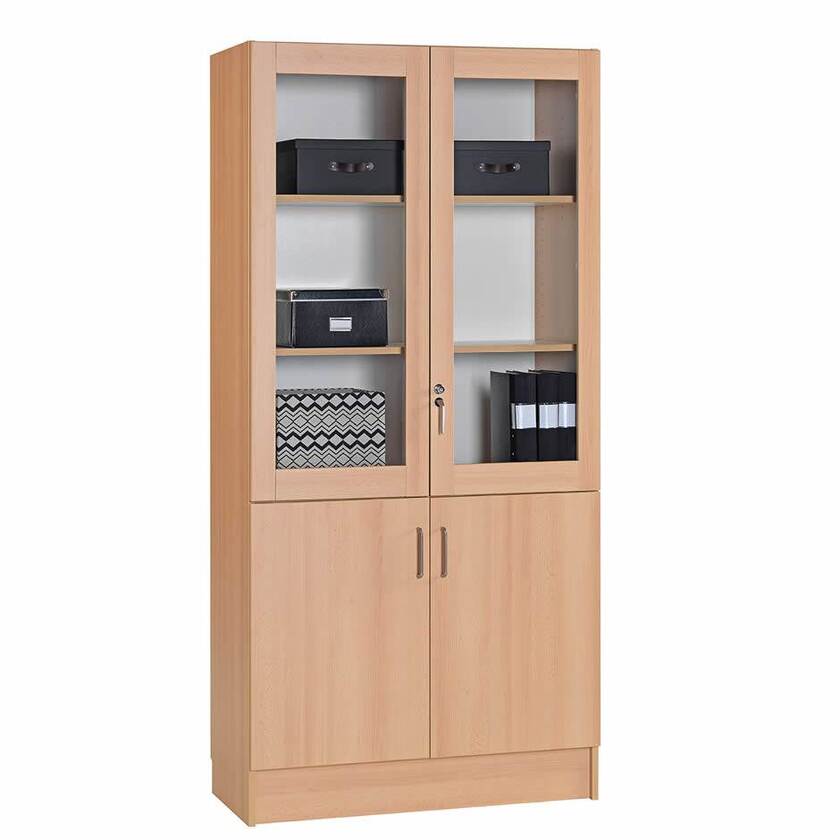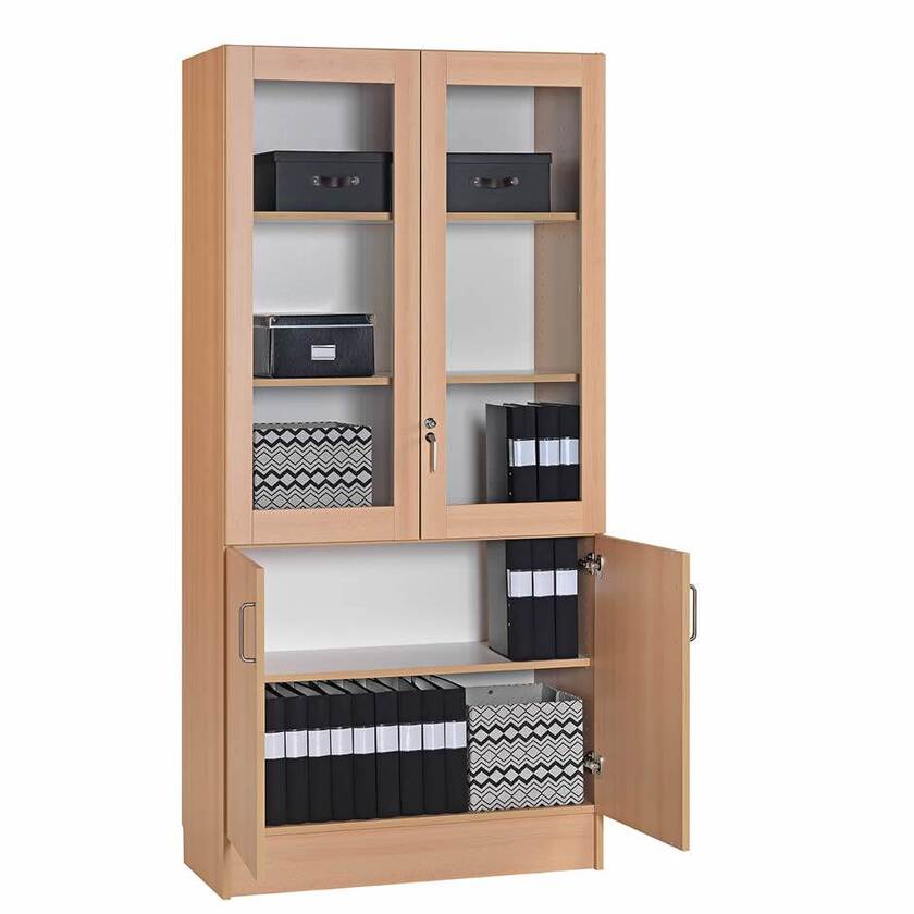 Kombiskåp av hög kvalitet med en mängd användningsområden. Tillverkat i bok-, björk- eller vit laminat med 19 mm stomme och dörrar. Överskåpet har glasdörrar och är utrustat med spanjolett och spanjoletthandtag. Underskåpet har dörrar i laminat med bygelhandtag. Samtliga hyllplan är flyttbara med 32 mm intervall.