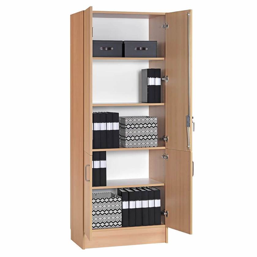 Kombiskåp av hög kvalitet med en mängd användningsområden. Tillverkat i bok-, björk- eller vit laminat med 19 mm stomme och dörrar, laminatdörrar i både över- och underskåp. Överskåpet är utrustat med spanjolett och spanjoletthandtag. Underskåpet har dörrar med bygelhandtag. Samtliga hyllplan är flyttbara med 32 mm intervall.