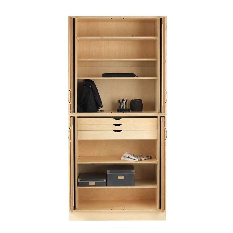 Ett robust, attraktiv och smart skåp för förvaring. Stomme och inredning i 18 mm björkplywood som ger både stabilitet och hållbarhet. Dörrar designade så att du enkelt kan skjuta in dem ut med skåpets sida.Inga mer svingande dörrar som är i vägen. Sjöbergs skåp kan inredas på många olika sätt för att möta behovet av förvaring av verktyg, textilier, kontorsmateriel, datorer m m. Välj björk-, whiteboard- eller glasdörrar.