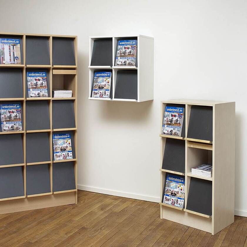Alvesta är en praktisk tidskriftshylla för både exponering och förvaring. Exponeringshyllan kan fällas upp och skjutas in vid behov.