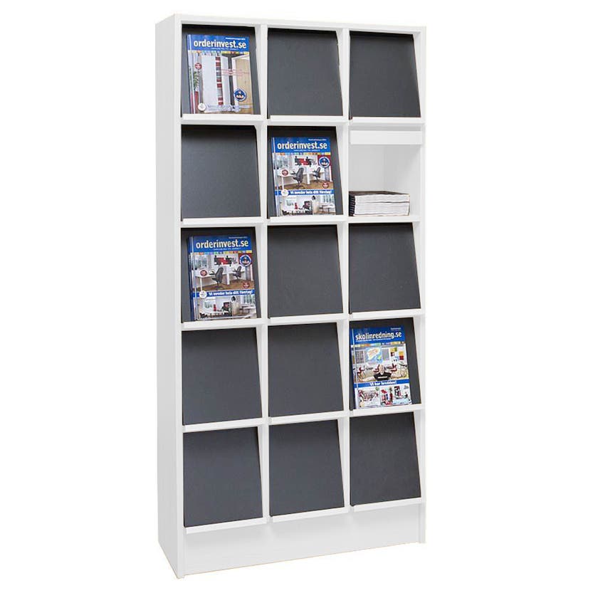 Tidskriftshylla Alvesta, med förvaringsmöjlighet, 15 fack, 838x400x1800 mm