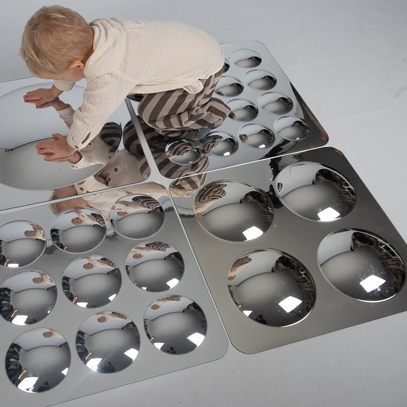 Spegel med fyra konvexa kupoler som skapar unika och förvrängda reflektioner. De lekfulla reflektionerna uppmuntrar utforskande, kreativt tänkande och upptäckarglädje. På så vis stimuleras nyfikenhet, visuell perception och observationsförmåga. Spegeln passar perfekt för klassrum, förskolor eller lekrum och kan användas både individuellt och i gruppaktiviteter som främjar lärande genom lek.