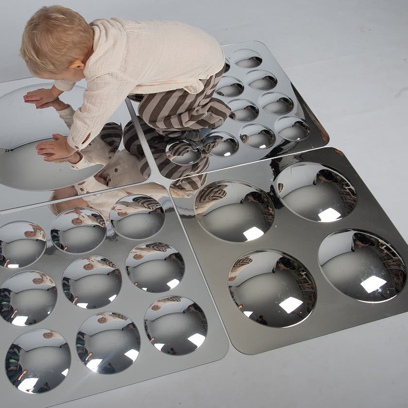 Spegel med nio konvexa kupoler som skapar unika och förvrängda reflektioner. De lekfulla reflektionerna uppmuntrar utforskande, kreativt tänkande och upptäckarglädje. På så vis stimuleras nyfikenhet, visuell perception och observationsförmåga. Spegeln passar perfekt för klassrum, förskolor eller lekrum och kan användas både individuellt och i gruppaktiviteter som främjar lärande genom lek.