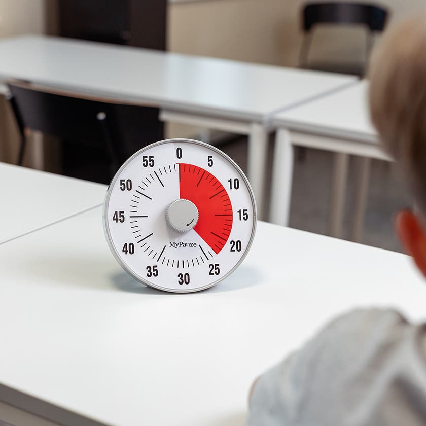 Liten och smidig koncentrationsklocka som kan användas direkt på bordet, hängas upp på vägg eller fästas på magnettavla. Klockan räknar pedagogiskt ner tiden som är kvar på lektionen eller arbetsuppgiften, där det röda fältet minskar i klockans riktning. Detta underlättar koncentrationsförmågan och ger en ökad studiero i klassrummet. Extremt tystgående, knappt hörbar. Inställningsbar från 0-60 minuter.