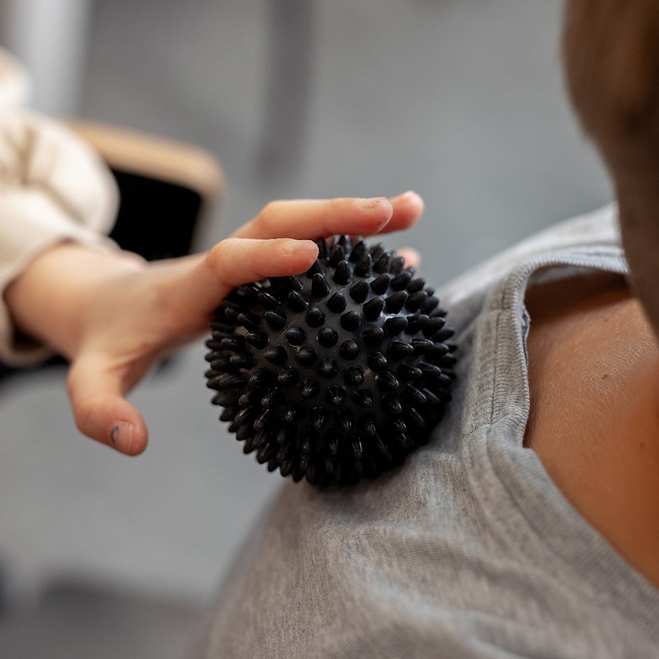 Massageboll MyPauze, med piggar, hård, Ø75 mm, svart