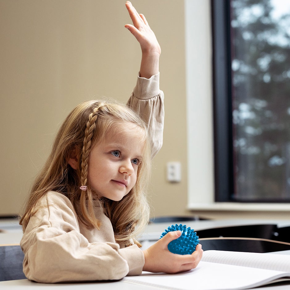 Greppvänlig massageboll med piggar, ett ergonomiskt och taktilt hjälpmedel som ger ökad blodcirkulation och stimuli. Ger en avslappnande känsla samtidigt som den tränar muskulaturen i hand och underarm. Kan rullas över hela kroppen på sig själv eller mellan elever. Bra att hålla i handen för att underlätta koncentration och inlärning hos elever som har svårt att sitta still.