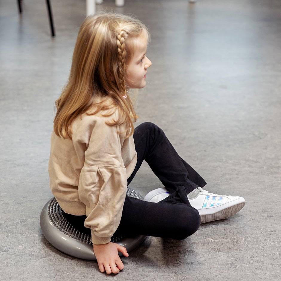 En luftfylld massagekudde främjar aktivt sittande och hjälper rastlösa ben. Kan användas på en stol så eleven rör sig diskret utan att tappa fokus och på så vis få bättre studiero. Den knottriga sidan stimulerar blodcirkulation och känsel, medan sidan med små kulor är perfekt att sitta eller stå på. Fungerar också utmärkt att använda direkt på golvet för balansövningar, massage eller muskelträning. Från 3 år.