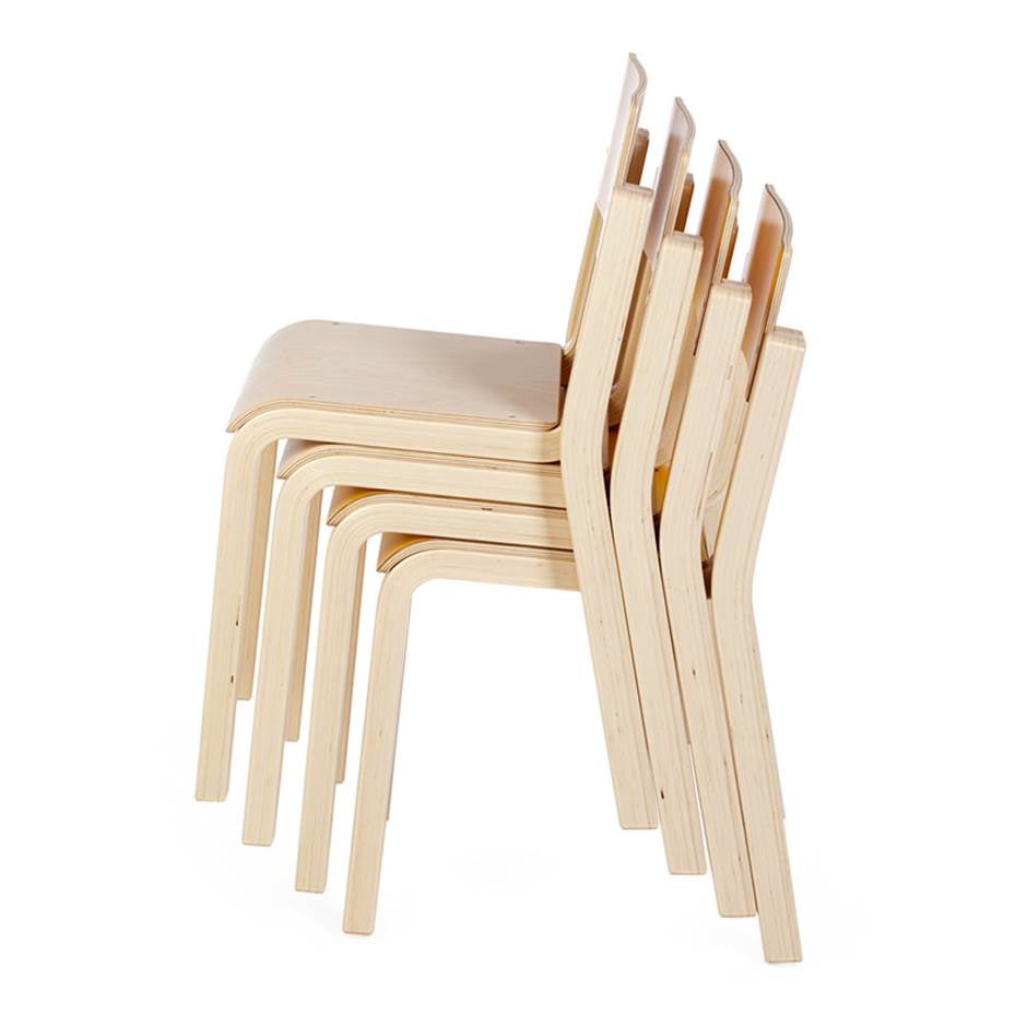 Komfortabel stol för elever i förskola. Tillverkad i formpressad björk-plywood. Saknar helt skarpa kanter. Lätt och ändå stabil. Staplingsbar. Valbar i höjderna 380 eller 350 mm. Välj till filttass för extra ljuddämpning.