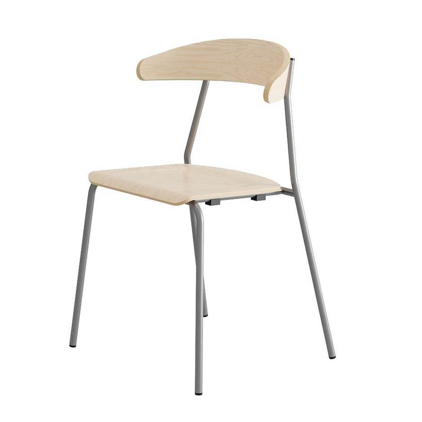 Stativ av 18 mm stålrör i färgen grå RAL 9006. Sits och rygg finns i följande dekorfärger vit, bok, björk, svart eller grå laminat. Denna stol är byggd, testad och godkänd för bruk i offentlig miljö enligt EN 16139:2014
