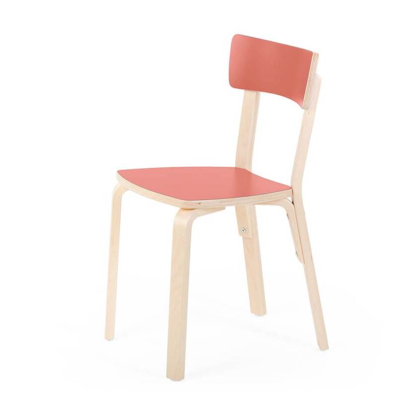Stol i hög kvalitet. Tillverkad i formpressad björk. Standardvarianten har heltäckande björkfanér. Finns med rygg och sits i gul, röd, blå, vit eller grön laminat. Välj mellan 3 olika storlekar 380, 400 eller 420 mm sitthöjd.