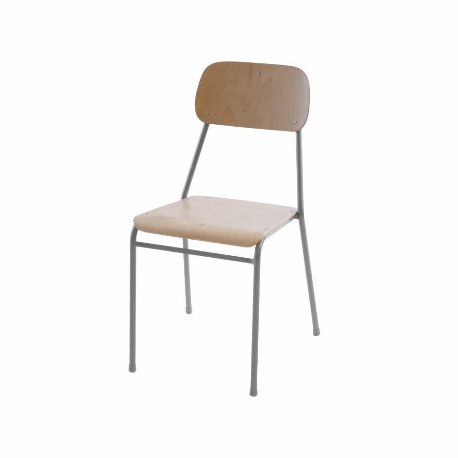 Klassisk stapelstol med formpressad sits och rygg i björkfanér, alternativt svart lack. Stativ Ø 19mm.