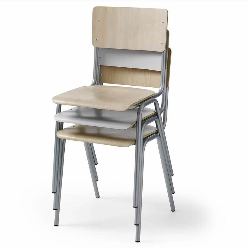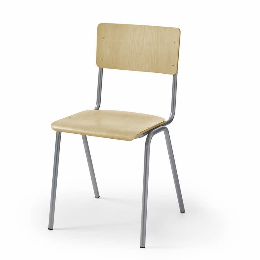 Traditionell skolstol som du hittar på varje skola. Bra sittkomfort med skålad sits och mjukt svängd rygg. Tar liten plats vid stapling. Silvergrått, lackerat stativ. Högtryckslaminerad rygg/sits valbart i bok, björk, svart, grått eller vitt utförande. Stolsbenen är försedda med filttassar.