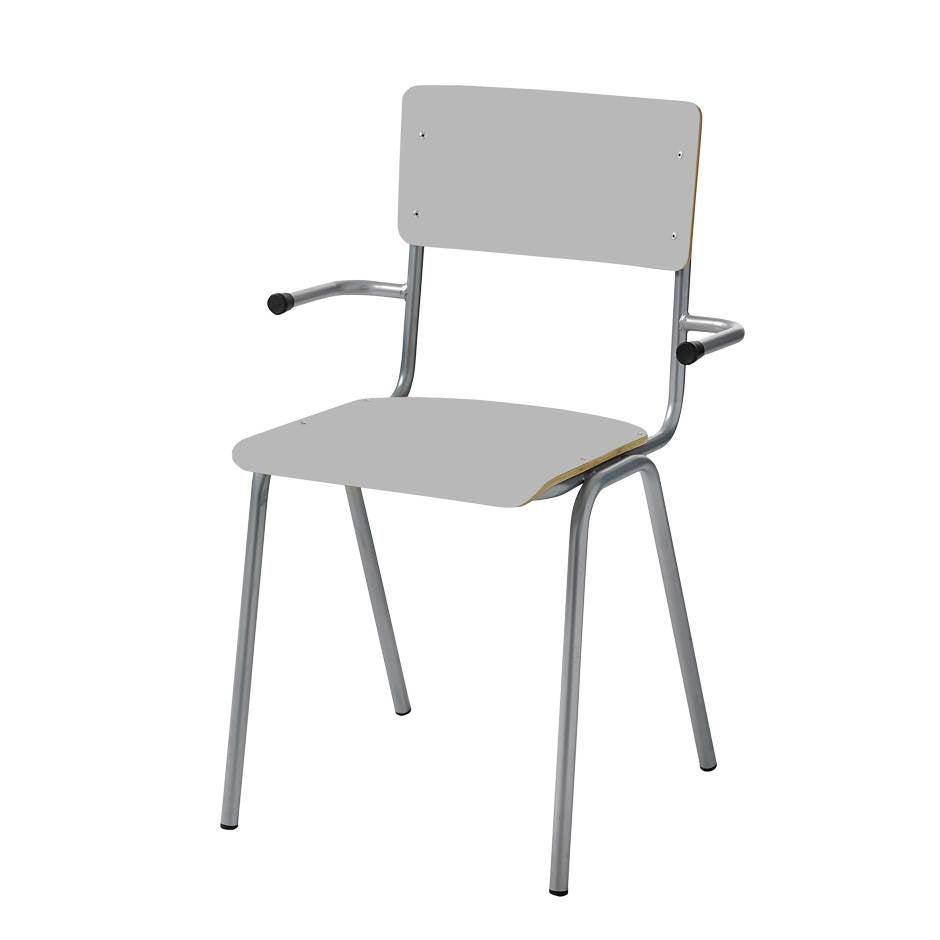 Traditionell skolstol som du hittar på varje skola. Bra sittkomfort med skålad sits och mjukt svängd rygg. Tar liten plats vid stapling. Sits och rygg i högtryckslaminat. Utrustad med filttassar. Grått stativ. Väl mellan bok-, björk-, vitt-, grått- eller svart laminat.