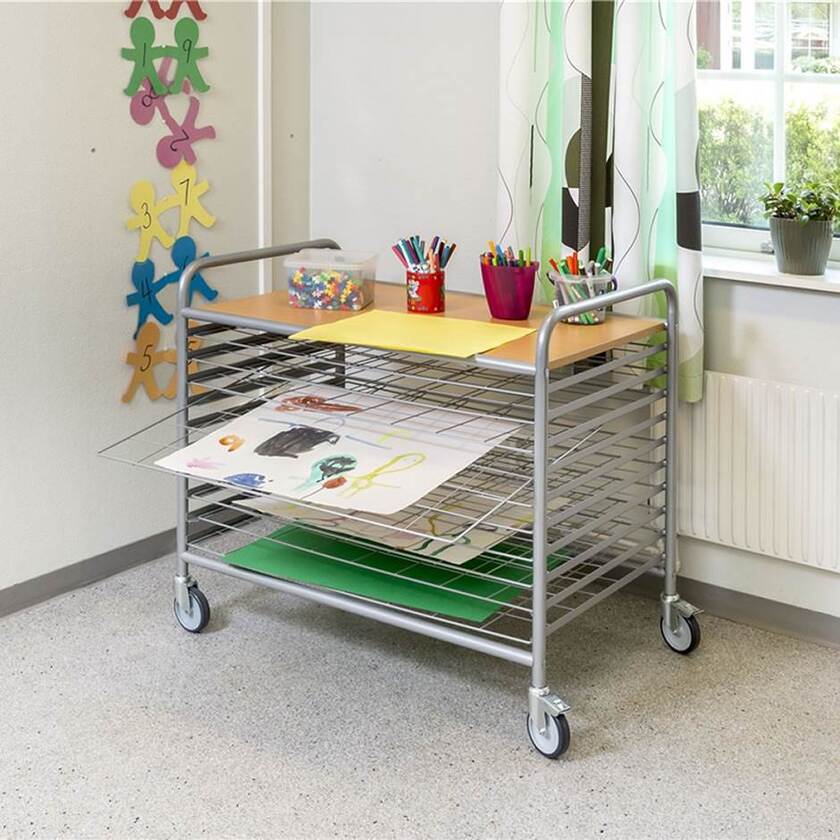 Praktisk torkvagn för skola, förskola, daglig verksamhet och fritidshem. Smidig förvaring av barnens konstverk. Torkvagnens utdragbara hyllplan är gallerförsedda så att papper med vattenfärg torkar plant och håller sin form under torkningen. Den översta hyllan av boklaminat är utmärkt för förvaring av kostnärsmateriel såsom färger, penslar och kritor. Trots att torkvagnen har 15 plan mäter den endast 1010 mm till övre hyllplan och gör det alltså lätt för barnen att nå översta hyllan.