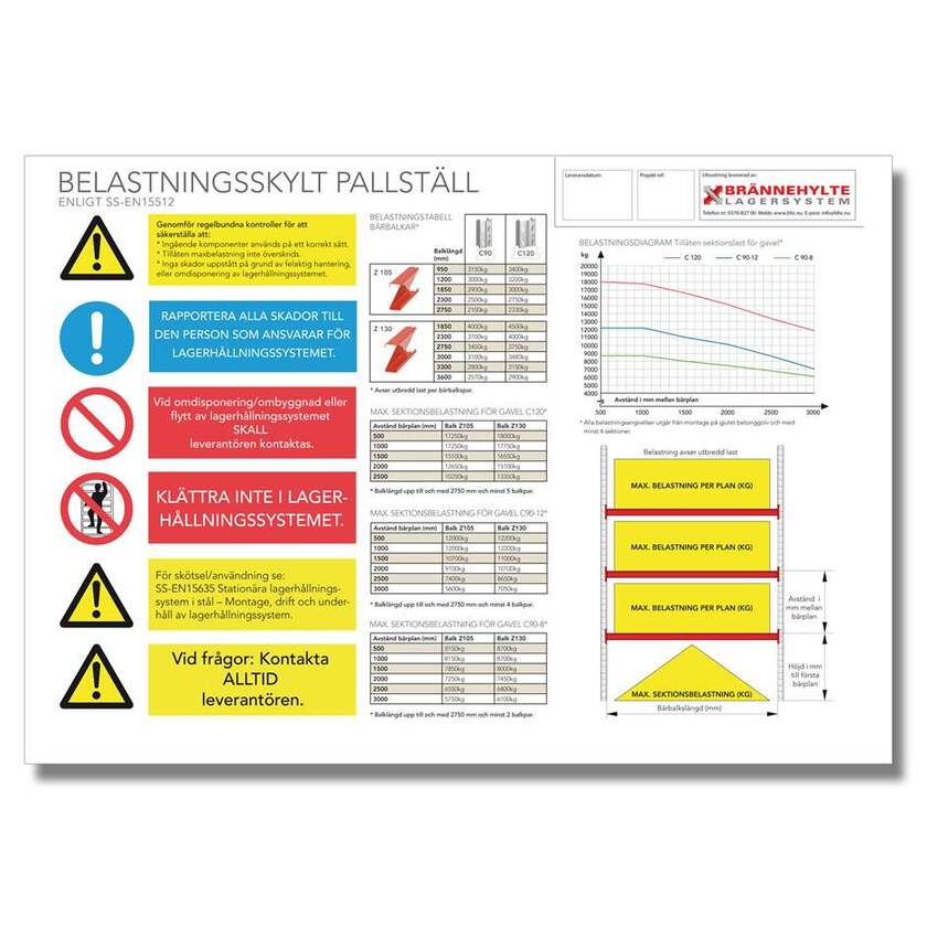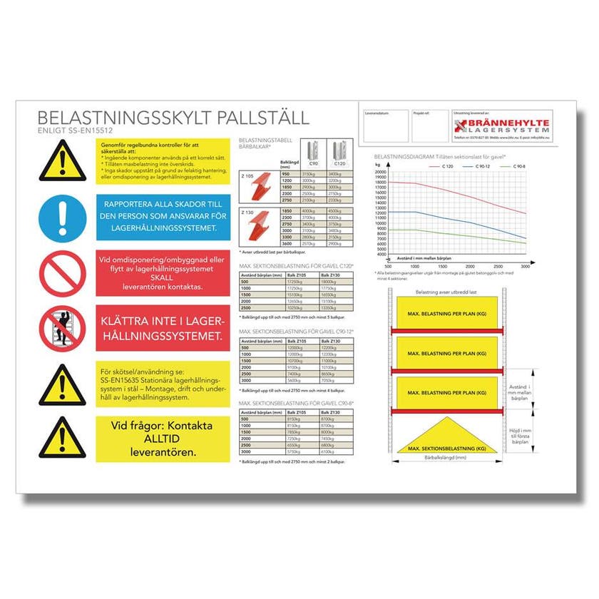 Glöm inte att beställa belastningsskylten till ditt pallställ! Enligt krav från Arbetsmiljöverket skall det finnas minst en skylt per anläggning. Vår belastningsskylt är i A3-format och monteras enkelt på gavelstegen.