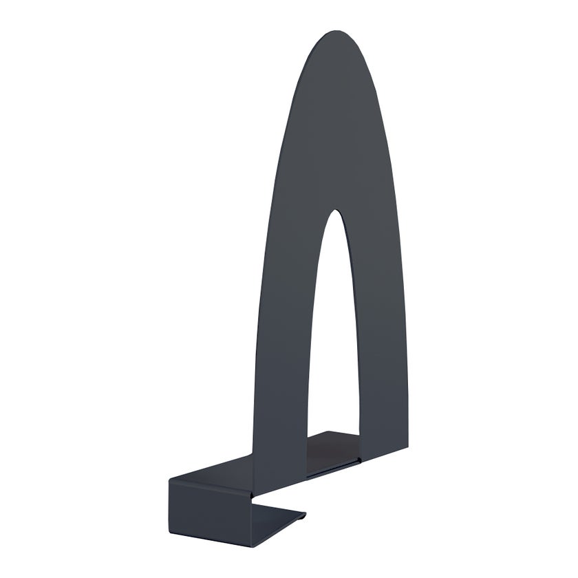 Rundat bokstöd för 18 - 22 mm tjocka trähyllor. Kläms fast på hyllplanet. Välj mellan vänster- eller högerutförande. Mått H200 x D125 mm. Som standard lackerat i fägerna grå, vit eller svart.