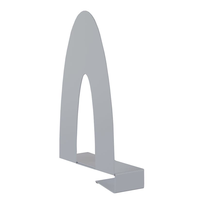 Rundat bokstöd för 18 - 22 mm tjocka trähyllor. Kläms fast på hyllplanet. Välj mellan vänster- eller högerutförande. Mått H200 x D125 mm. Som standard lackerat i fägerna grå, vit eller svart.