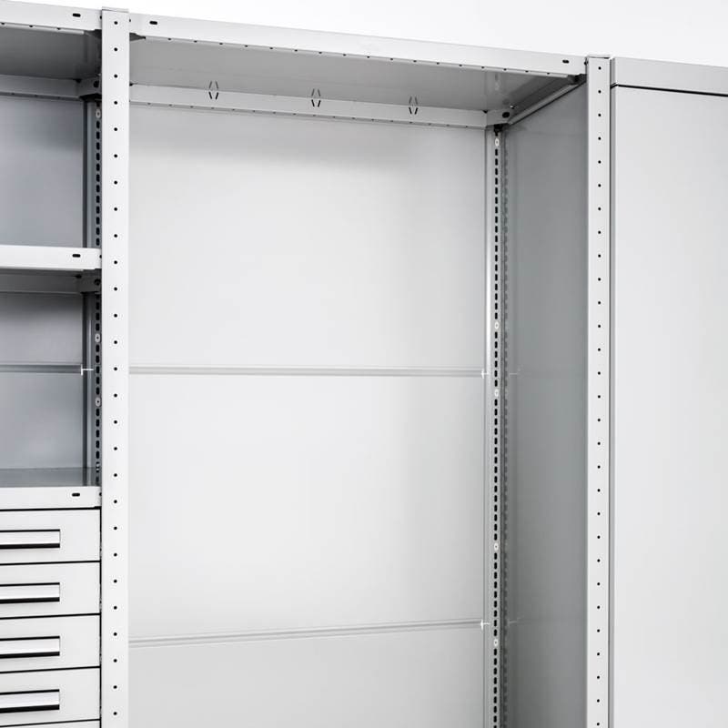 Ryggplåt för stålhylla Meta Quick. Lackerad i ljusgrå färg (RAL 7035).