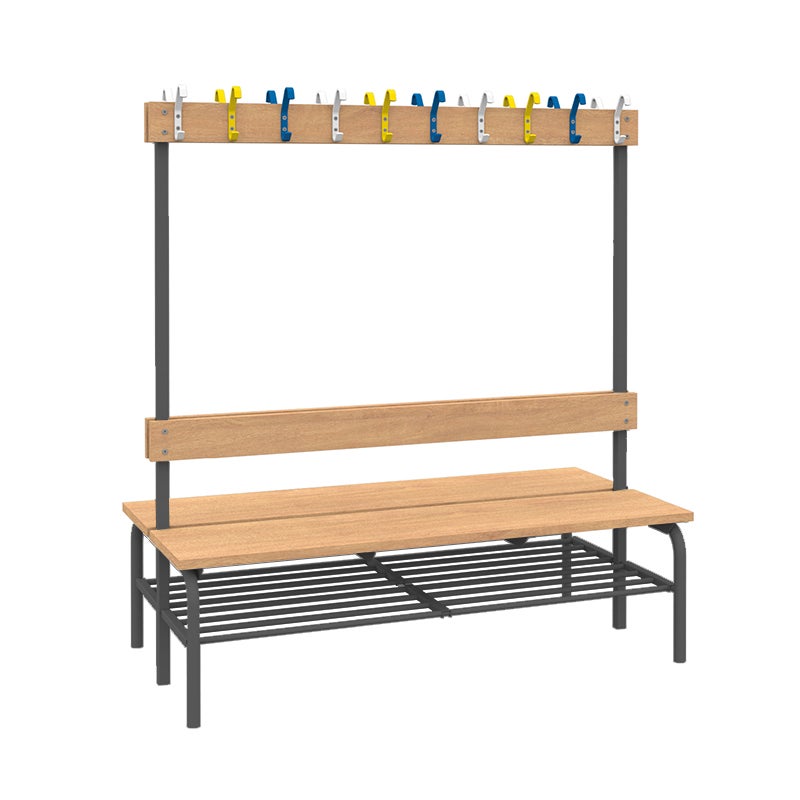 Skohylla för enkelsidig omklädningsbänk med längd 2000 mm. Kraftiga ståldetaljer pulverlackerade i silvergrå (RAL 9006) eller svart (RAL 9005) färg.